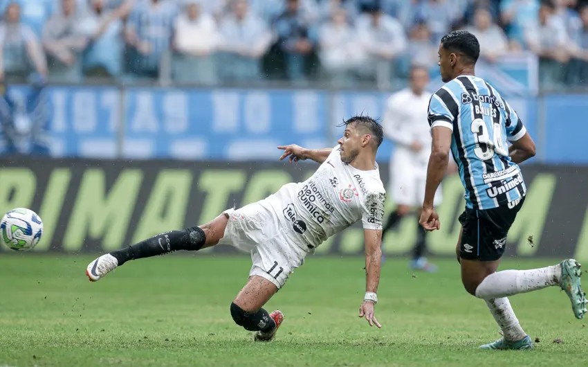 Grêmio buscando trocar passes até chegar ao gol. Corinthians partindo em contra-ataques principalmente pelo lado esquerdo com o Bidu e o Renato Augusto. Bruno Méndez foi expulso justamente após uma falta muito violenta no Bezossi. Depois da expulsão o Timão simplesmente não conseguia sair jogando. Bezossi e Reinaldo jogaram muito bem. Romero e...